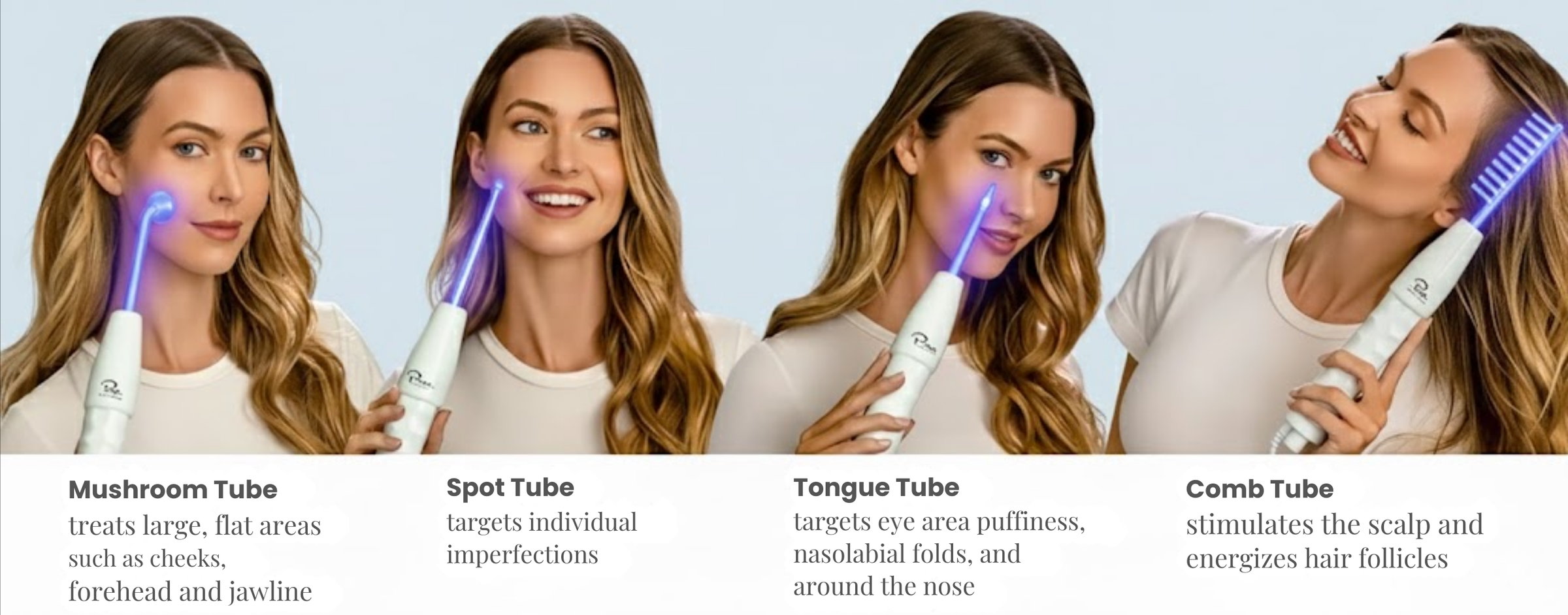 Each VOOMII Eutic Wand set includes 4 targeted glass electrode attachments, each designed for specific skin concerns.